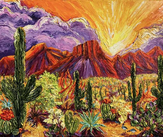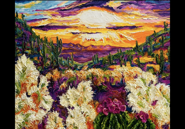 Paris paints from her studio in Pueblo, Colorado, where the surrounding landscape and shifting light continue to inspire her work. Her bold palette, sculptural textures, and expressive knife work create paintings that feel both vibrant and deeply personal.