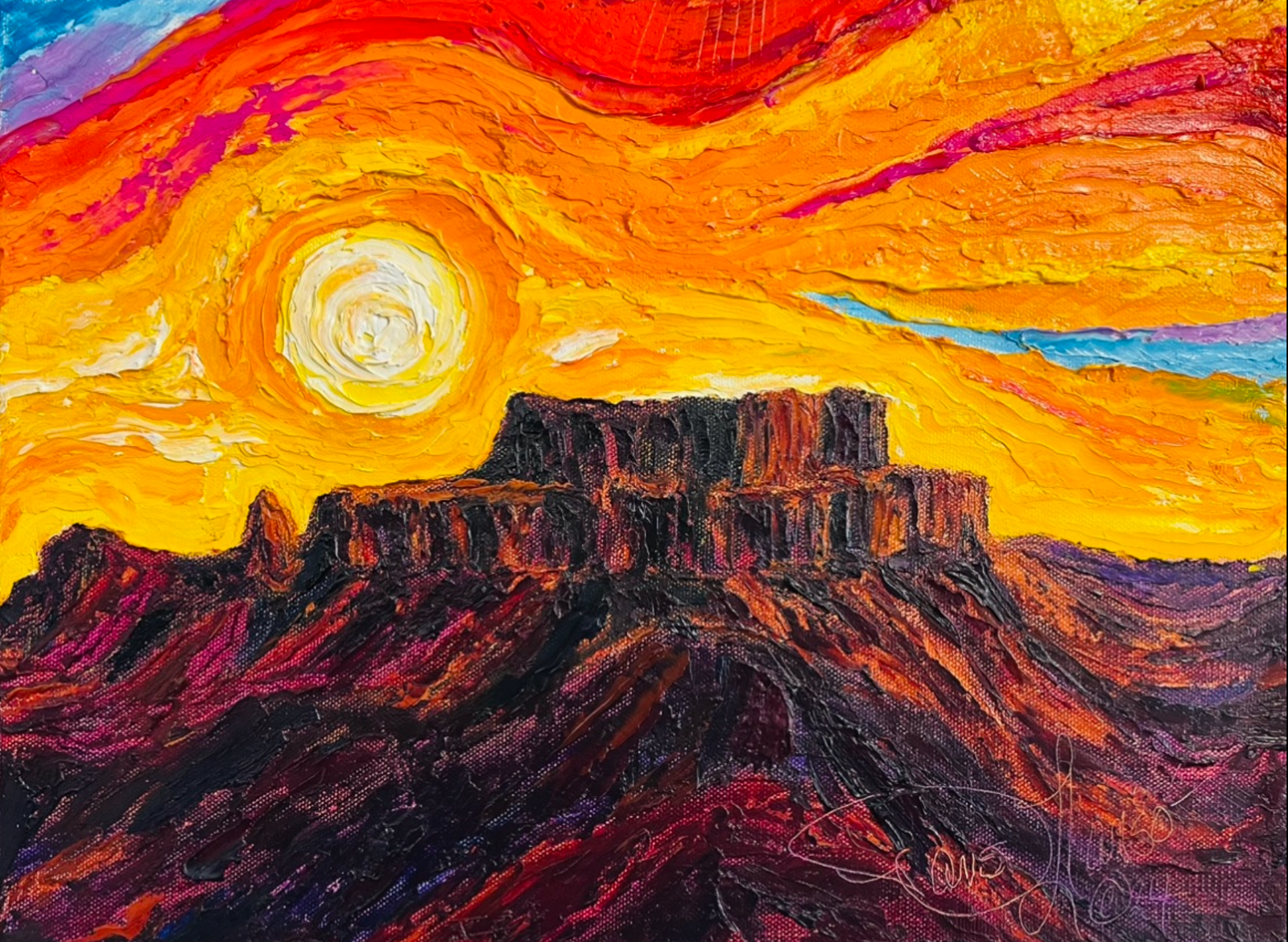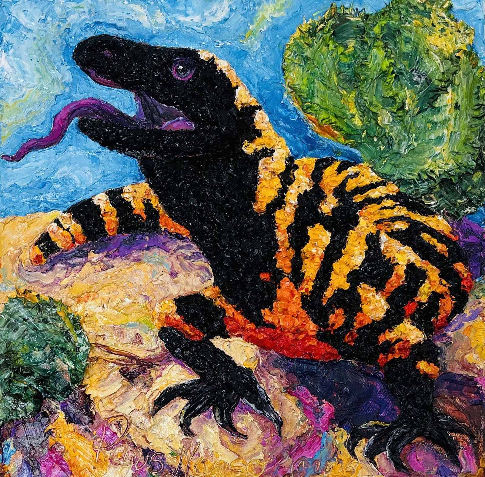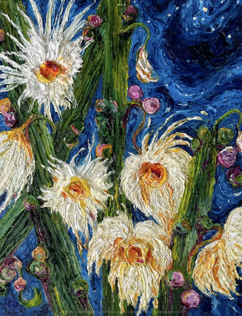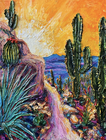 Each original painting is shaped by thick impasto texture and Paris’s signature bold palette. Her work is recognized internationally for its distinctive three-dimensional presence.