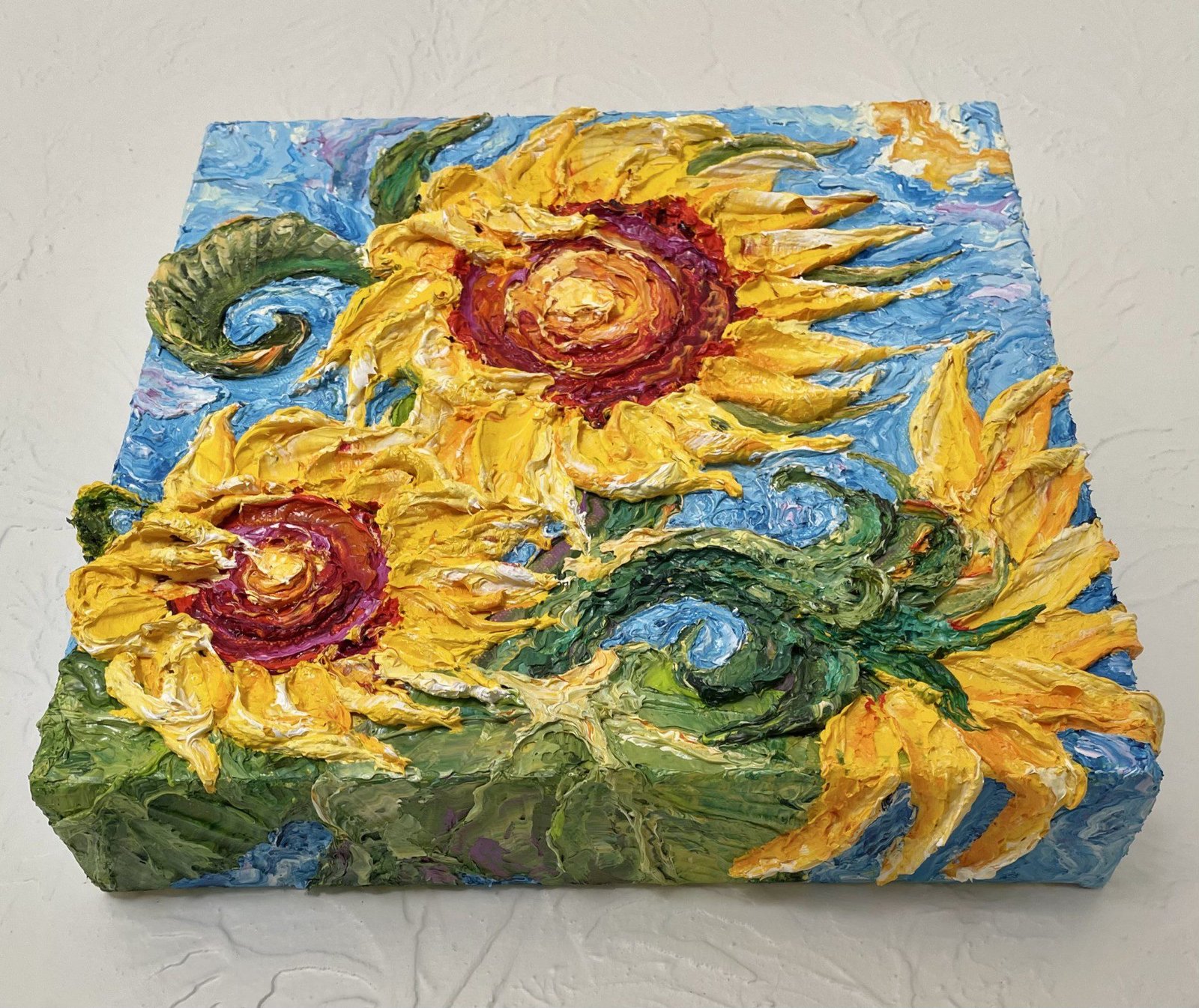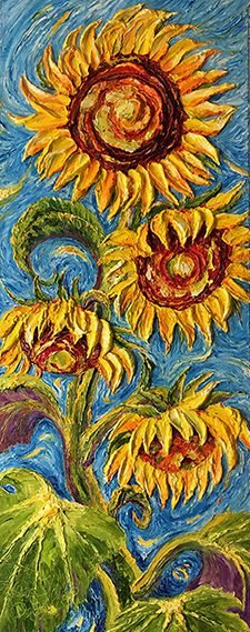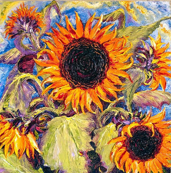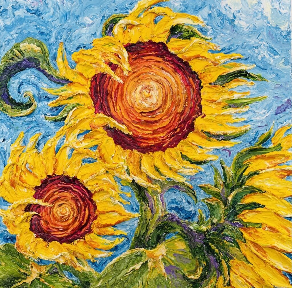Her art has found homes in private and public collections, with collectors drawn to the emotion, movement, and unmistakable dimension of her work. Each painting is an original expression — textured, luminous, and created to be experienced in person.